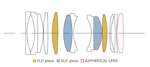 Na konstrukcję optyczną tego obiektywu składa się 13 soczewek ustawionych w 10 grupach. Zostało tu zastosowane 5 elementów specjalnych: dwie soczewki z niskodyspersyjnego szkła SLD oraz dwie soczekwki FLD wykonane ze szkła o właściwościach fluorytu, jak i dwie soczewki asferyczne.